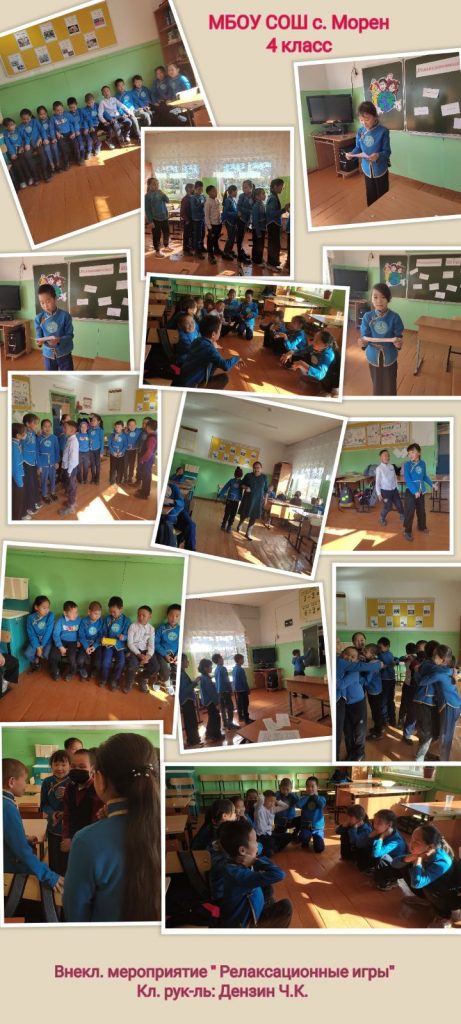 В 4 классе школы с. Морен в рамках месячника психологической безопасности проведено внеклассное мероприятие «Релаксационные игры» целью, которых является снятие мышечного и психологического напряжения, установление межличностных контактов, создания в классе благоприятного микроклимата, развитие у учащихся способности к невербальному общению, воспитание бережного отношения друг к другу.