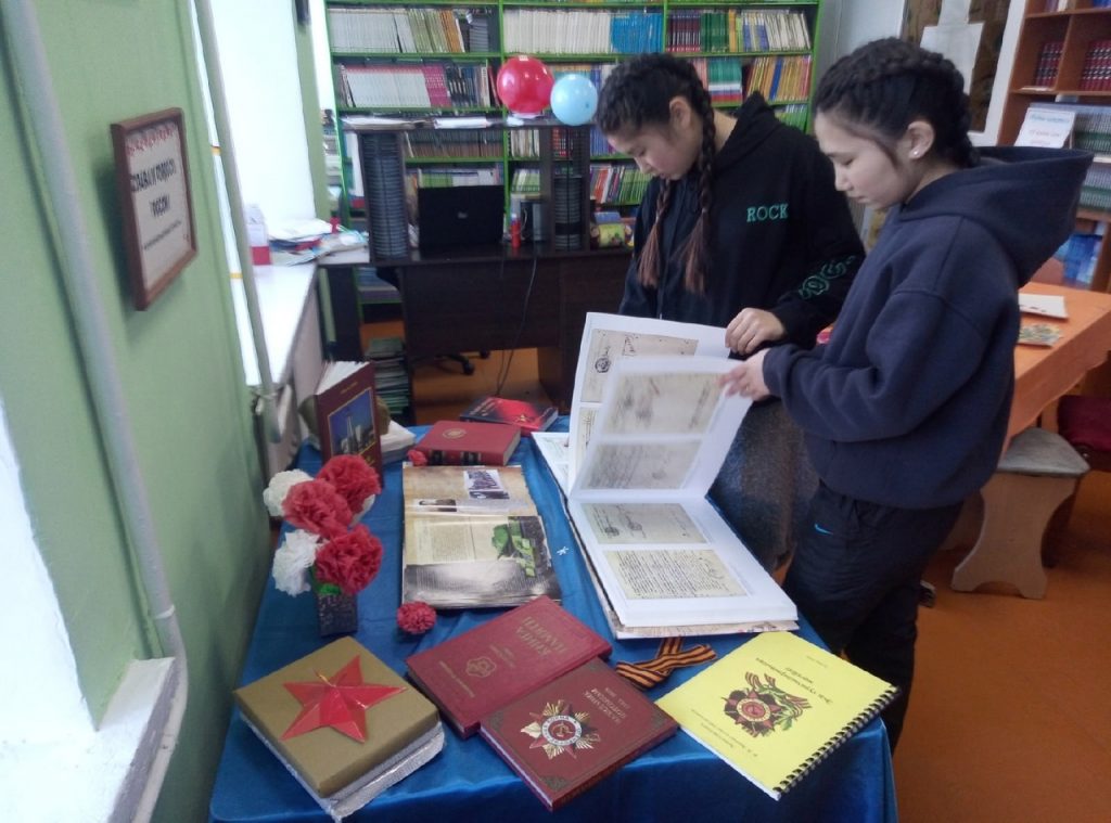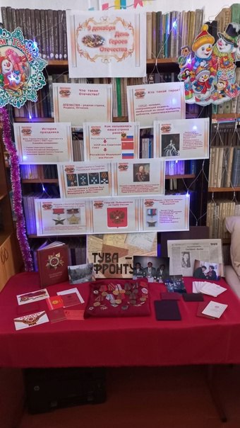 - Ко Дню Героев Отечества в библиотеках школ были оформлены книжные выставки «Слава и гордость России». Были представлены книги Героя России С. К. Шойгу «Тува – фронту», З. К. Монгуш» Честь и доблесть солдат из Тувы», А. Комбу» Эрзиннин эрес-дидим дайынчылары»,» Книга памяти»,» Назидание потомкам» и др. — охват 347 учащихся;