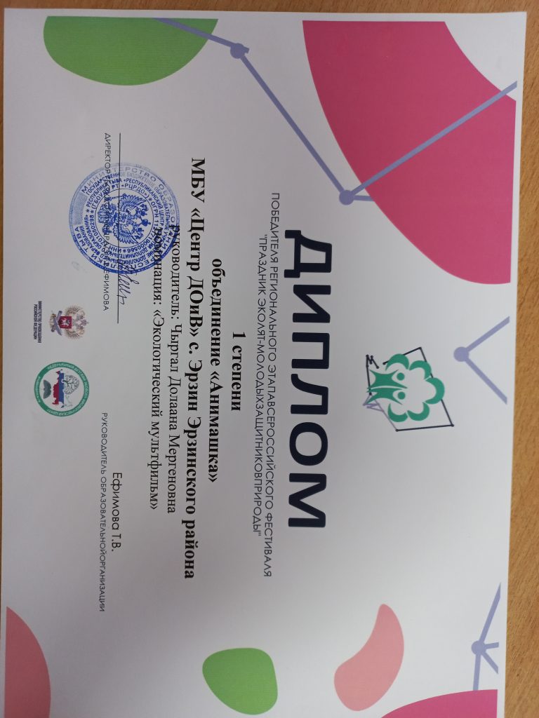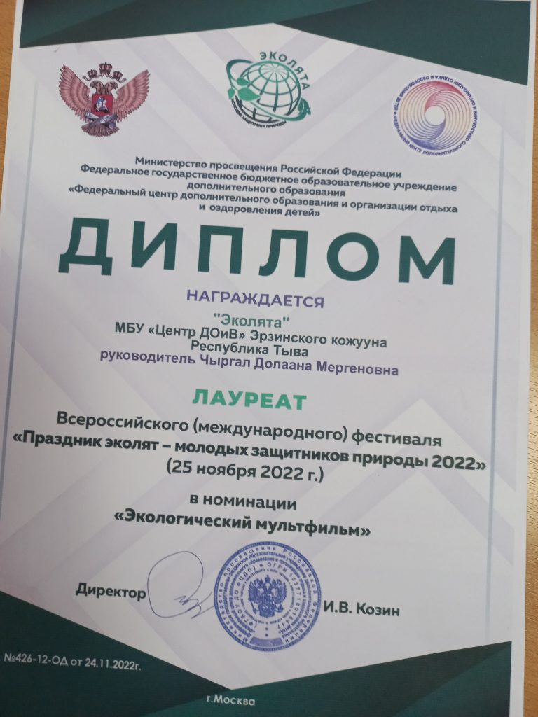 Кружок «Эколята» стал лауреатом Всероссийского (международного) фестиваля «Праздник эколят — молодых защитников природы 2022» в номинации «Экологический мультфильм». Руководитель Чыргал Долаана Мергеновна. Приказ 426-12-ОД от 24.11.2022
